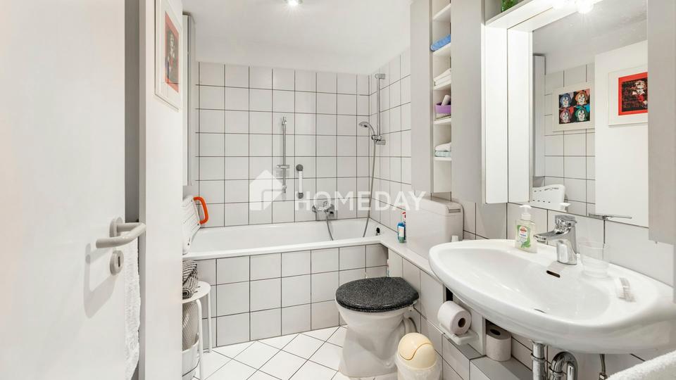 Die Wohnung besticht durch einen großzügigen Wohnraum mit breiter Fensterfront, die für viel Tageslicht sorgt und den Blick in die grüne Nachbarschaft freigibt. Vom Wohnzimmer aus gelangt man auf den langgezogenen, überdachten Balkon, der Platz für eine Sitzgruppe oder kleine Bepflanzung bietet. Angrenzend befindet sich die praktische Küche mit Fenster. Das ruhig gelegene Schlafzimmer ist ebenso wie der Wohnbereich freundlich und hell und bietet ausreichend Platz für ein Doppelbett und Stauraum. Das gepflegte Tageslichtbad ist mit Badewanne ausgestattet.