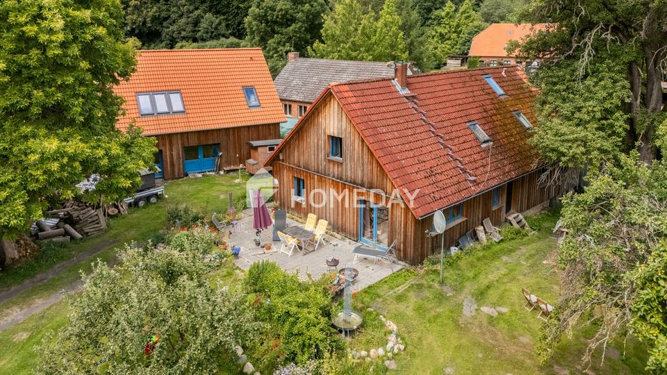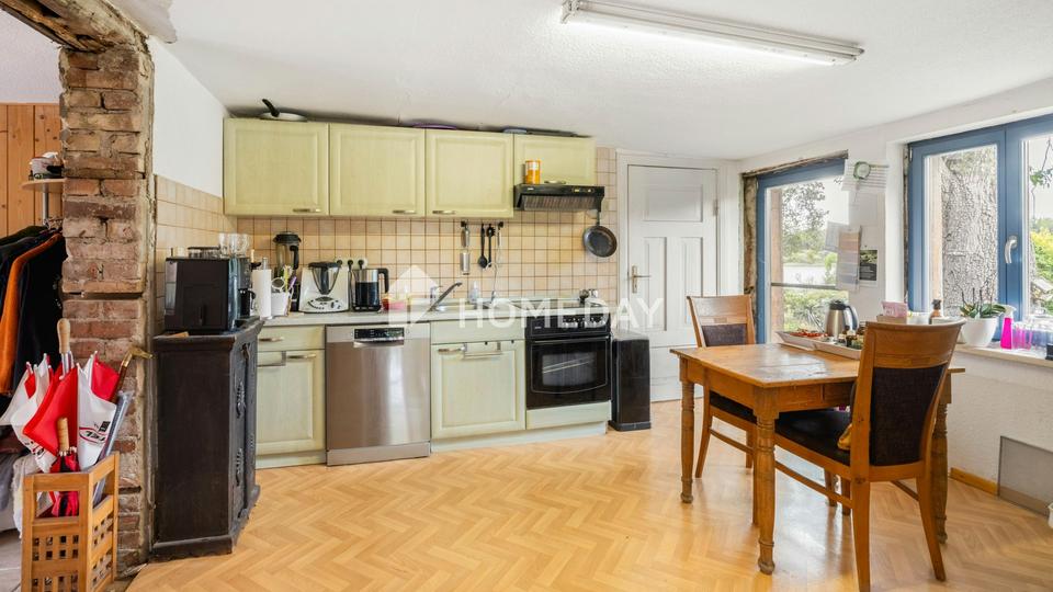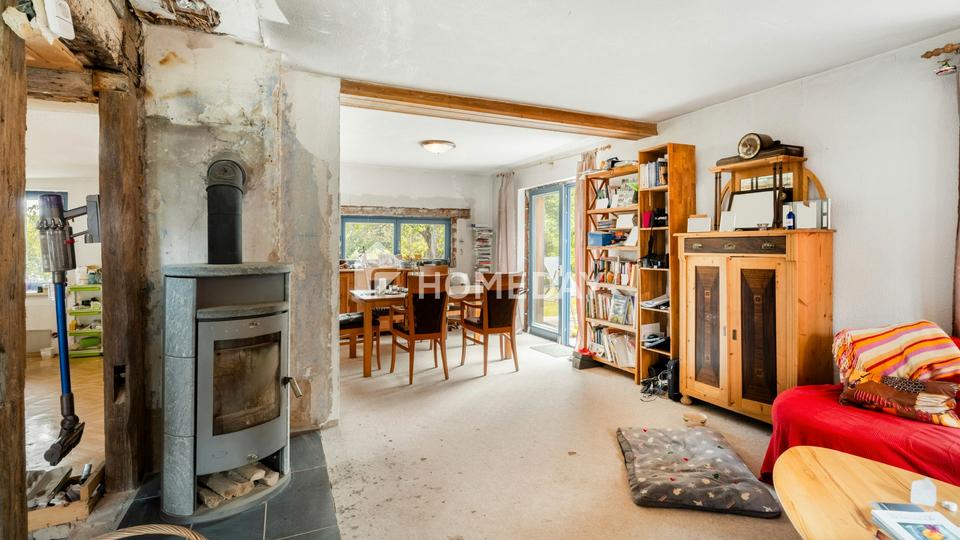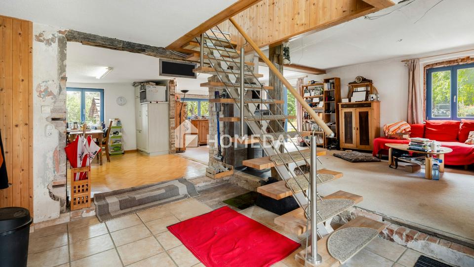 Besonders hervorzuheben ist das zweite Gebäude auf dem Grundstück: Von außen bereits einladend, wartet es innen auf die individuelle Gestaltung seiner neuen Eigentümer. Ob als eigenständige Wohneinheit, Atelier, Praxis oder Ferienunterkunft – hier eröffnen sich zusätzliche Perspektiven.