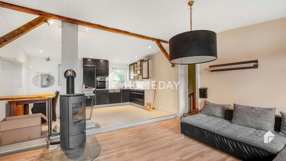 Im Obergeschoss zeigt sich der wohnliche Charakter: Eine offene Küche geht fließend in das Wohnzimmer über, ein Kaminofen sorgt für behagliche Wärme. Zwei Bäder erhöhen den Komfort – eines mit großer Eckbadewanne, das zweite aktuell im Ausbau, sodass Sie eigene Ideen umsetzen können. Große Fensterflächen lassen viel Licht einfallen und unterstreichen die einladende Atmosphäre.
