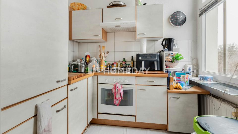 Die Wohnräume sind mit langlebigen Fliesen sowie Auslegware ausgestattet und bieten damit eine praktische und pflegeleichte Grundlage für unterschiedliche Einrichtungskonzepte. Die vorhandene Einbauküche ist funktional gestaltet und fügt sich harmonisch in den Grundriss ein. Das Badezimmer ist mit einer Dusche ausgestattet und erfüllt die Anforderungen an den täglichen Komfort in kompakter und zweckmäßiger Form.